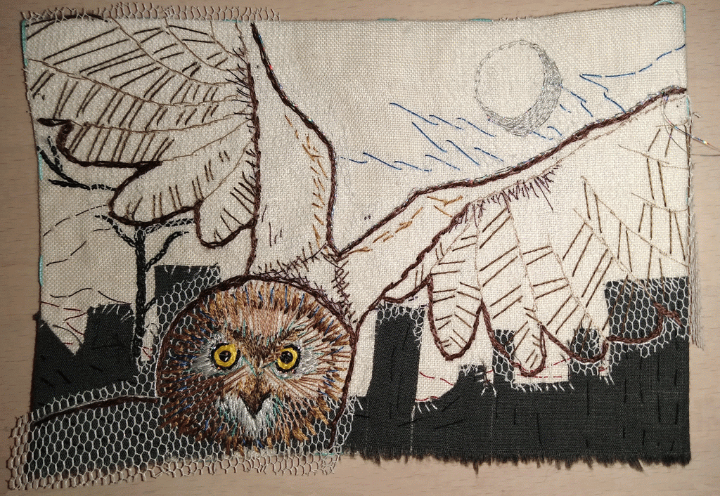 I responded with smooth textures and small stitches, using net as a point of material correspondence with the previous work. The owl awakens in a crepuscular urban setting, having travelled in time, space and position. As the closed eyes were the central focus of the previous work, I positioned the head in the same place with the eyes opened and focused. The wings are less worked to give a sense of movement, with the manmade elements in the scene visible beyond suggesting its fleeting, ghostly nature.